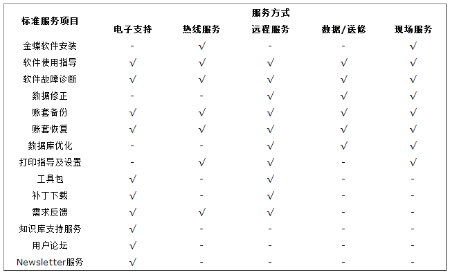 金蝶通过电子支持、热线服务、远程服务、数据/送修服务、现场服务五种方式向客户提供各项标准维护服务。